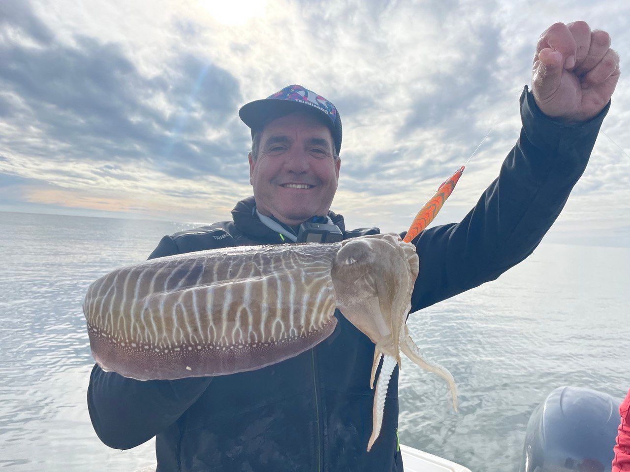 Tras el paso de dos temporales seguidos en el mes de diciembre del 2.022, nos encontramos con el agua turbia por completo en todas las capas, hemos disfrutado de dos salidas a cefalópodos con muy buenas capturas de gran porte, chocos con pesos que pasan los dos kilos y calamares que rondan el kilo de peso. C uando el agua está tan turbia los señuelos que marcan la diferencia son los de colores vivos, naranjas sobre todo, si tienen bolitas en su interior que producen vibraciones mejor, puesto que en condiciones en el que el agua está tan turbia el poder de atracción de los sonajeros es fundamental. El material que he utilizado en esta ocasión para la practica de la modalidad de Tip Run es una caña Hart Bloody Tataki-80 y un carrete Penn Spinfisher 2500, el trenzado es Asari Masaru Light Colors de 8 hebras de diametro 0,10 y una gameta de Asari Fluoro Carbón del 0,20mm, los señuelos Yamashita Egi Oh TR 3.5 de 30gr.